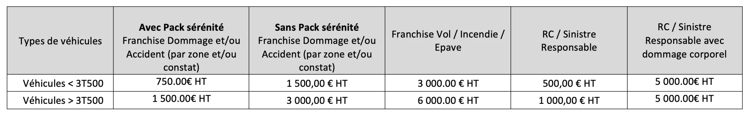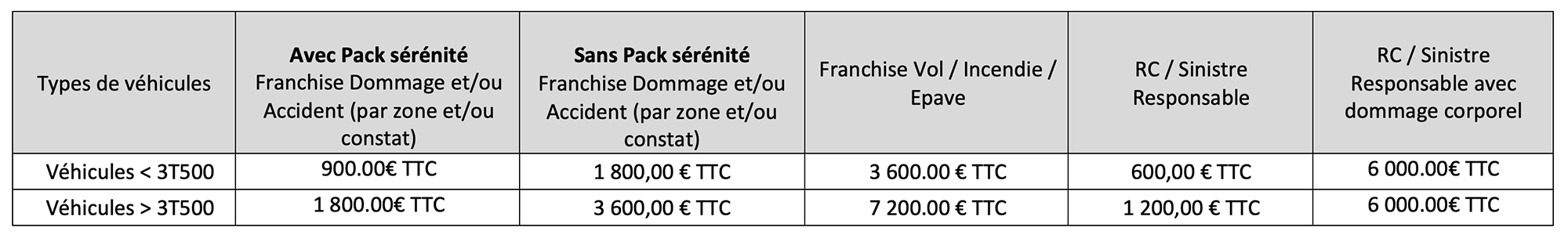 Le loueur répercute sur le locataire une franchise Responsabilité Civile, définie dans l’avenant « Conditions Tarifaires », en cas d’accident engageant la responsabilité dudit locataire ou de celle de ses préposés.